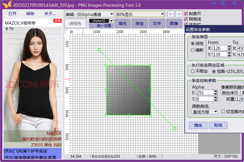 1.支持各种图片格式装入(编辑后保存为PNG格式文件)。 2.支持快速直接设置任意RGB透明色。 3.支持圆角填充模式设置图片区域Alpha值。 4.支持渐变模式设置图片区域Alpha值。 5.支持输入Alpha通道值文字。 6.支持外部载入其他图像并选取某一通道(RGBA之一)拷贝入当前Alpha通道。 7.软件免费,可随意分发使用,欢迎用户提供更好的建议。